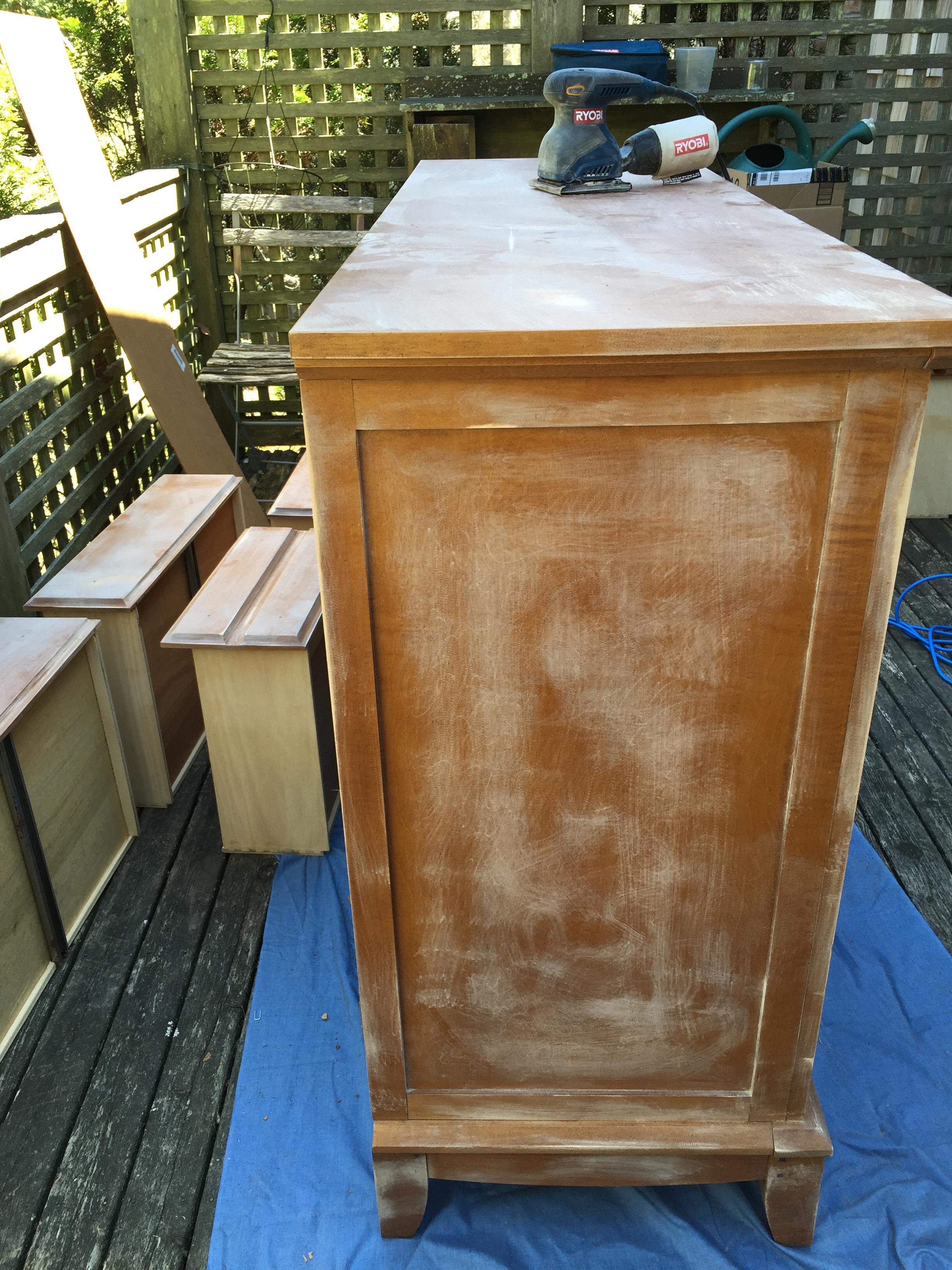 For years, I’ve had the same clunky set of wooden dressers in my Amagansett bedroom. I’ve perused yard sales and Craig’s List ads to try to replace them, as it hadn’t occurred to me that I could have a go at customizing them myself. Feeling inspired by summer around the bend and thanks to my handy mentor, Andrew, we carried the largest piece onto my back deck and created a weekend workshop.